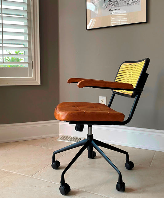 Rattan back Swivel Elton Arm Office Chair with Brown Distressed PU Leather Upholstering Seat and Castor Wheels
