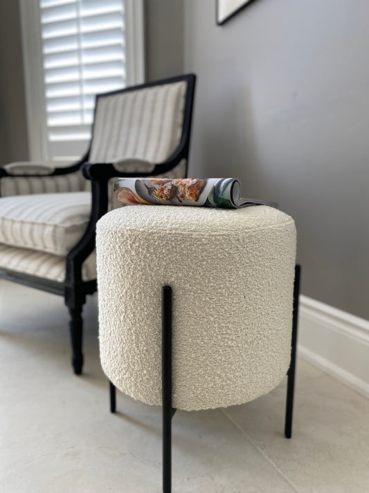 Boucle White Fabric Upholstery Round Metro Ottoman Pouf with Black Metal Frame