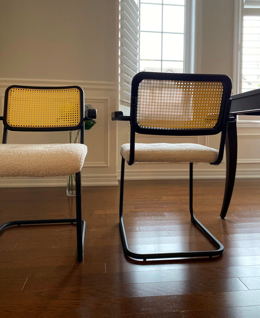 Boucle White Upholstered Rattan Back Elton Armed Dining Chair ,Office Chair Set (set of 2)