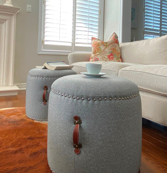 Round Upholstered Johnnie Ottoman Pouf, Vanity Stool with Pewter nail trimmed & Faux Leather handle-Dia20"x18"H