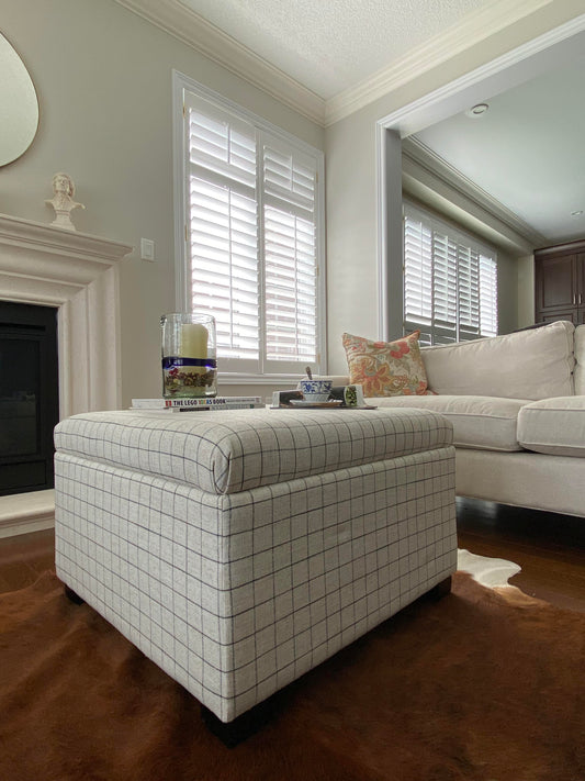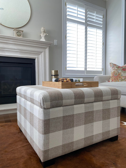 Large Plaid Linen Upholstered Roland Storage Cocktail Coffee Table Ottoman footstool-Cottage and Farmhouse coffee table-Large storage-Hinged lid