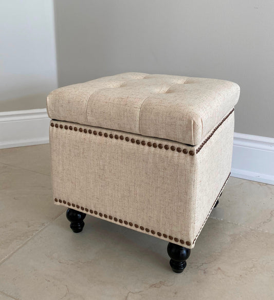 Beige Linen Fabric Upholstered Beckmann Storage Cube Pouf Ottoman, Footstool with Flip-Up Hinged lid